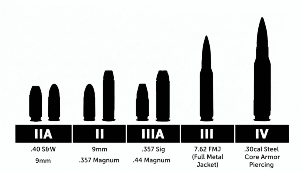 | Nível 2 | 7,62×39 mm API BZ (perfurante) | AK-47 perfurante | Acima do NIJ IIIA | Não existe NIJ civil que detenha AP de 7,62×39 sem ser placa rígida nível IV. |