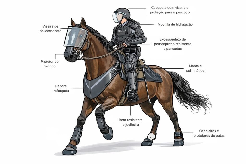 - Caneleiras e Joelheiras: Como as pernas do policial ficam expostas lateralmente no cavalo, são áreas vulneráveis a ataques de quem está no chão.