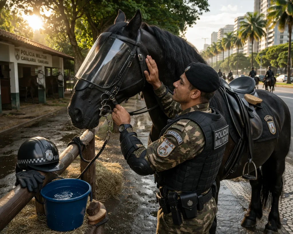 Um cavalo de polícia é considerado um “servidor público” de quatro patas. O cuidado com sua saúde e bem-estar é prioridade absoluta, tanto por questões éticas quanto pelo alto custo de treinamento de um novo animal.