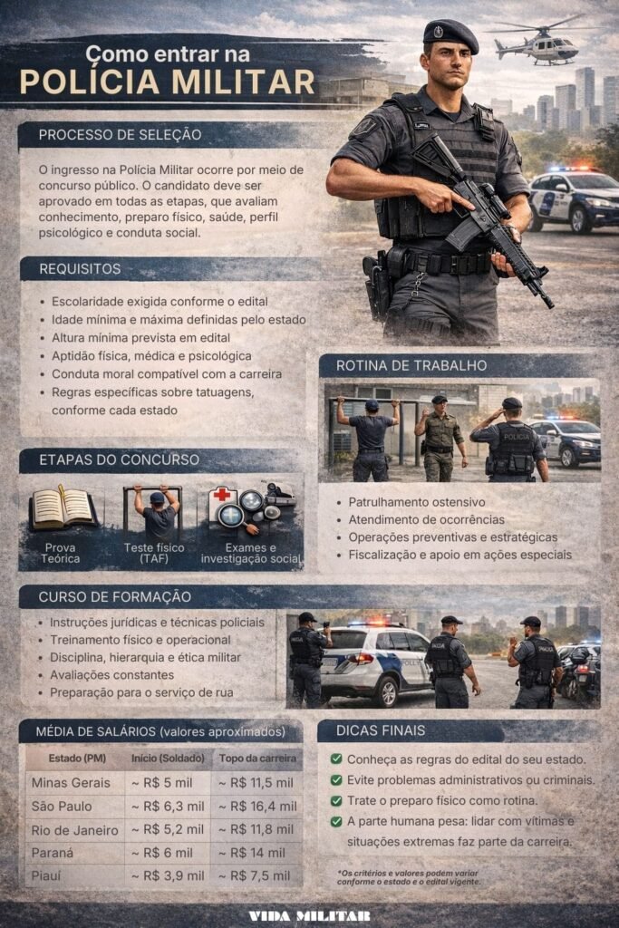 Entrar na Polícia Militar (PM) é um projeto grande: envolve preparação para concurso, condicionamento físico, aprovação em avaliações médicas e psicológicas, investigação social e, depois, um período intenso de formação com disciplina militar.