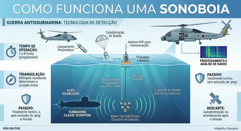 O helicóptero naval é, sem dúvida, o pior inimigo de um submarino, e a sonoboia é a sua principal arma de inteligência. Essa tecnologia permite que as forças de defesa projetem poder sobre as profundezas do oceano, garantindo a proteção de comboios, frotas e águas territoriais.