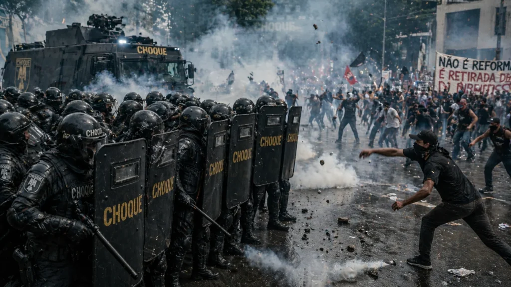 - Psicologia das Cores e Sons: Bater o cassetete no escudo não é só pra intimidar; é uma tática de guerra psicológica para desestabilizar a agressividade da multidão.